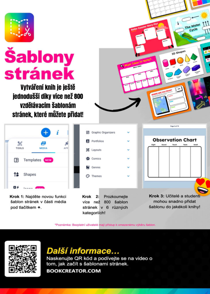 Velkou předností Book Creatoru jsou tematické šablony, které práci s knihami výrazně zjednodušují a inspirují k novým nápadům. K dispozici je přes osm set připravených stránek – od komiksů a vědeckých deníků až po osobní portfolia. Šablony jasně strukturovanou práci usnadňují, podporují kreativitu a šetří čas. Tvůrce se tam může soustředit na obsah a sdílení místo aby řešili technické detaily.
