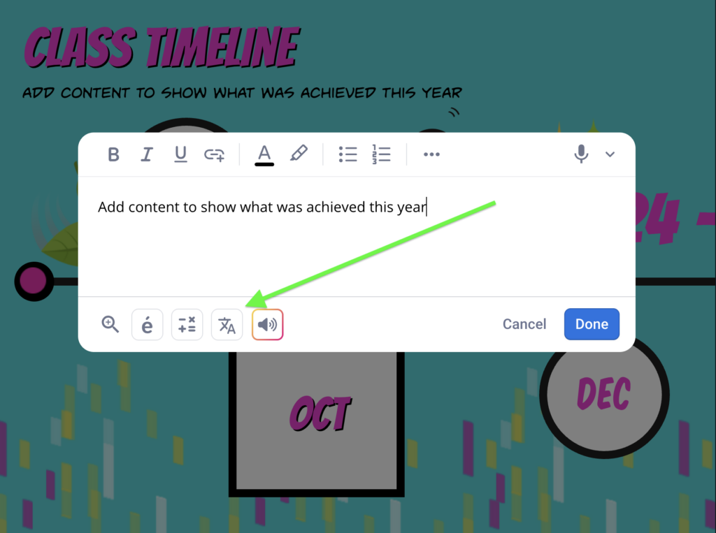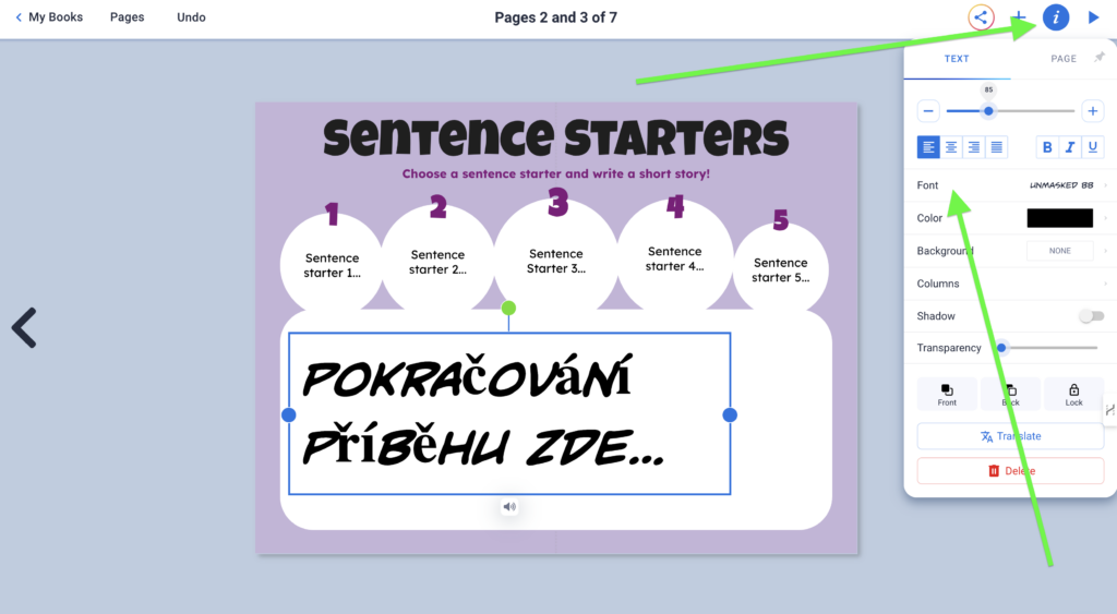 To už není žádný problém. Integrovaným nástrojem v editaci, právě v desktopové verzi je překladač do mnoha světových jazyků. Stačí jen u zvolené šablony na stránce kliknout do pole s textem a objeví se editační okno. Barva i font písma zůstanou zachovány, změní se pouze text.
