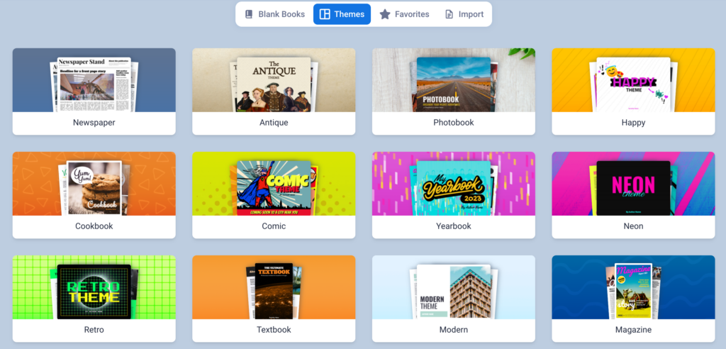 Funkce Themes umožňuje uživatelům vybrat si přednastavený vizuální styl celé knihy. Ten automaticky upraví vzhled všech stránek podle zvoleného motivu.