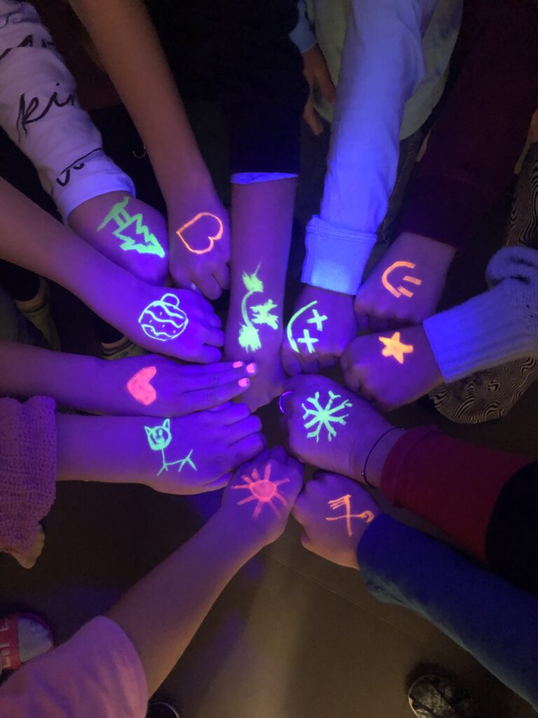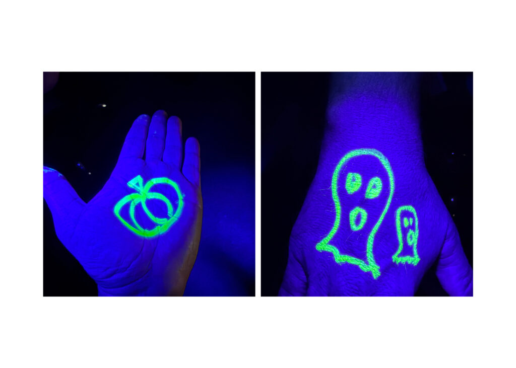 A jak na kouzlo tajemné kresby? Potřebujete klasické zvýrazňovače. Podle našich ověřených zkušeností bez problémů funguje žlutá, zelená, růžová, oranžová. S modrou a fialovou je to horší, chovají se nevyzpytatelně, záleží na konkrétním typu fixu, ale u výše vyjmenovaných máte jistotu. Kreslit můžete na černý i bílý papír, kůže na rukou je také zajímavý materiál.