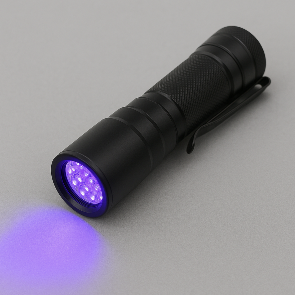 Druhou nutností je UV světlo. Jasně, běžně ho doma asi nemáte, ale například baterku s UV světlem koupíte za pár korun. Kdo chce sáhnout hlouběji do kapsy může si pořídit UV lampu na detekci bankovek.