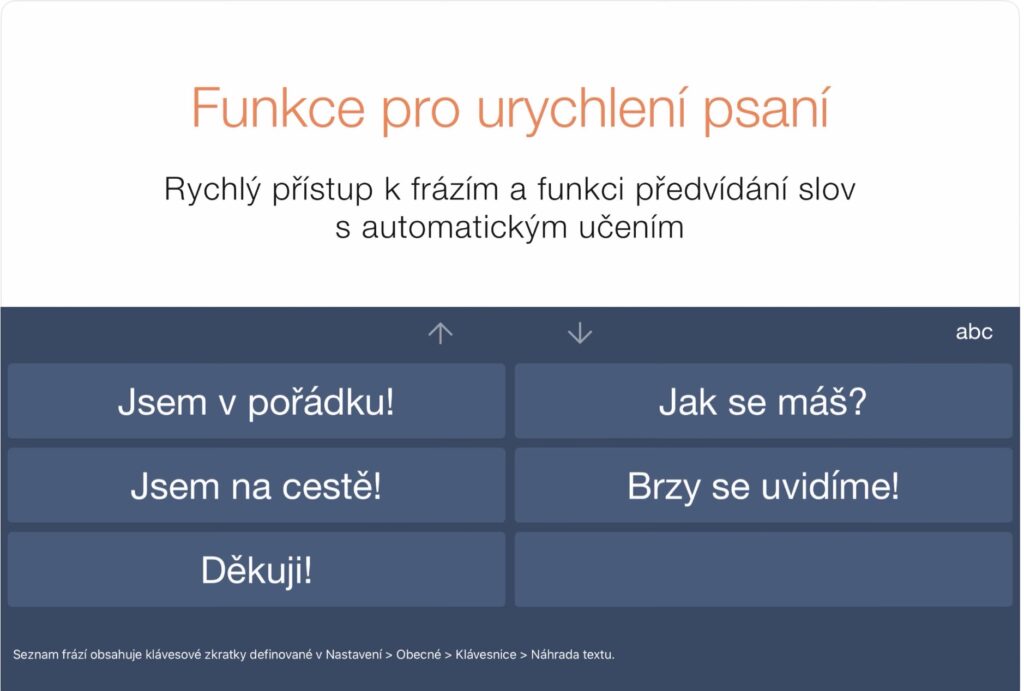- pokročilá předpověď slov a učení se na základě psaní (self‑learning prediction)