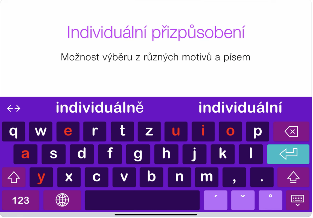 - klávesy zobrazují malá písmena, aby odpovídala podobě psaného textu,